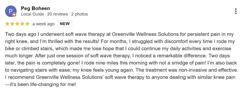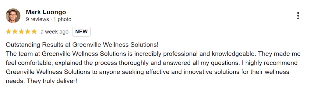 Disclaimer: Procedures and treatments performed by Greenville Wellness Solutions have an inherent success (and failure) rate. Reviews, testimonials and content on this site should not be interpreted as a statement of efficacy of procedures and treatments performed by Greenville Wellness Solutions for anyone else.
